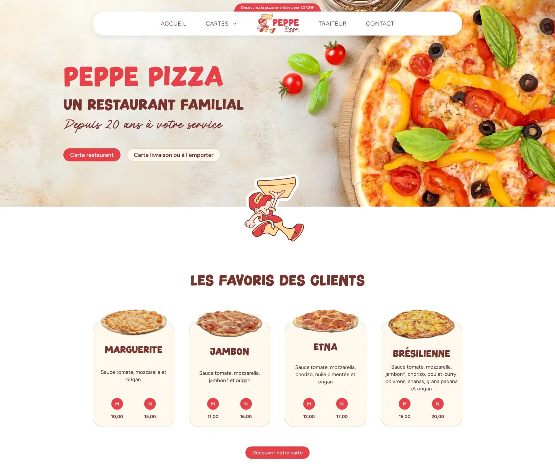 Peppe Pizza, restaurant familial installé au cœur du village d’Orvin dans la région du Grand Chasseral, a fait appel à Thimoo pour repenser entièrement son site internet et moderniser son univers visuel.